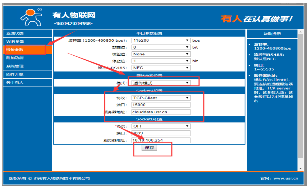 2、進入內置網(wǎng)頁(10.10.100.254)內置網(wǎng)頁的賬號和密碼都是admin。進入透傳參數(shù),選擇透傳模式,服務器地址:clouddata.usr.cn端口15000,保存