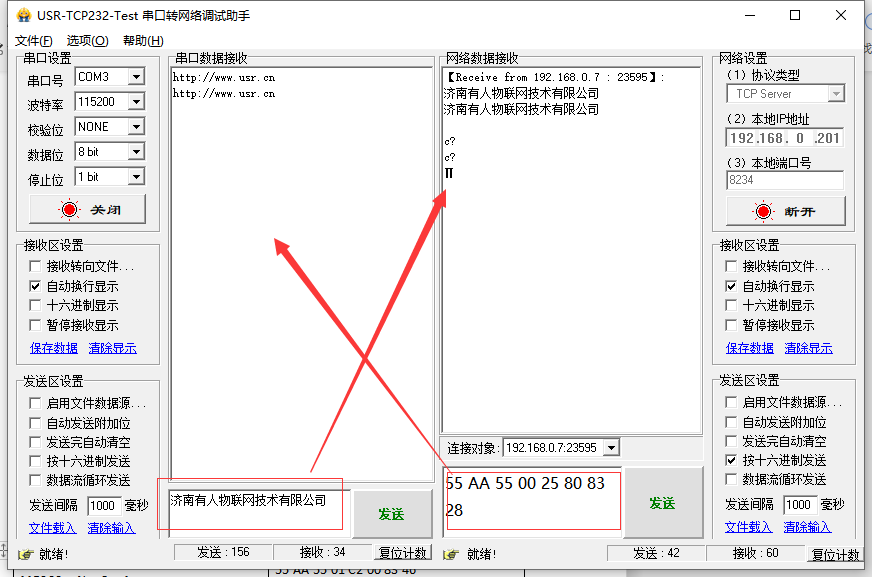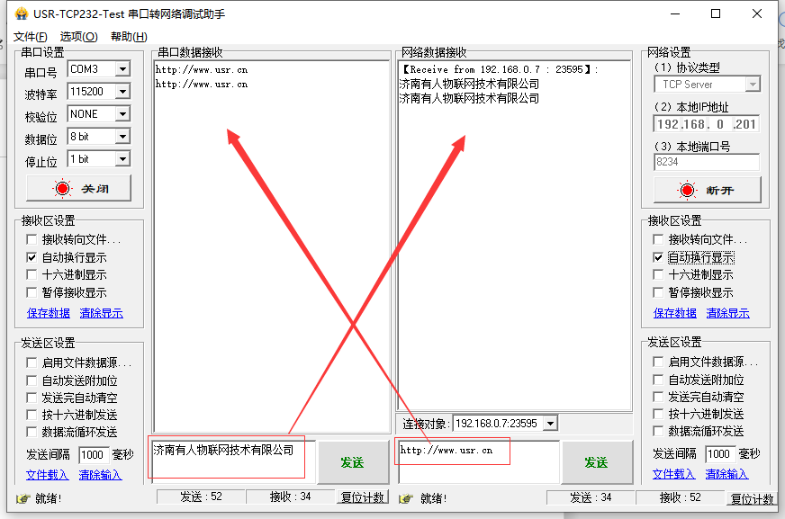 網(wǎng)絡(luò)端設(shè)置:由于設(shè)備默認(rèn)協(xié)議類型為TCP Client,所以電腦端連接設(shè)備需要設(shè)置為TCP server。服務(wù)器IP設(shè)置為電腦IP:192.168.0.201。端口號(hào)設(shè)置為302默認(rèn)參數(shù)中的“遠(yuǎn)程端口”:8234。