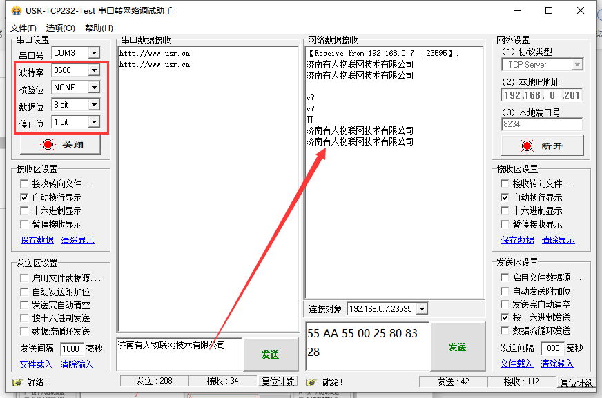 將模塊串口參數(shù)修改為9600、NONE、8、1,需要網(wǎng)絡(luò)端按十六進(jìn)制下發(fā)55 AA 55 00 25 80 83 28,發(fā)送完成后,軟件打開(kāi)串口需要修改為9600、NONE、8、1, 不然數(shù)據(jù)會(huì)顯示為亂碼。