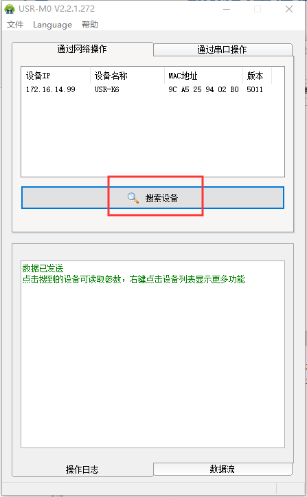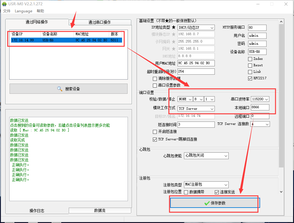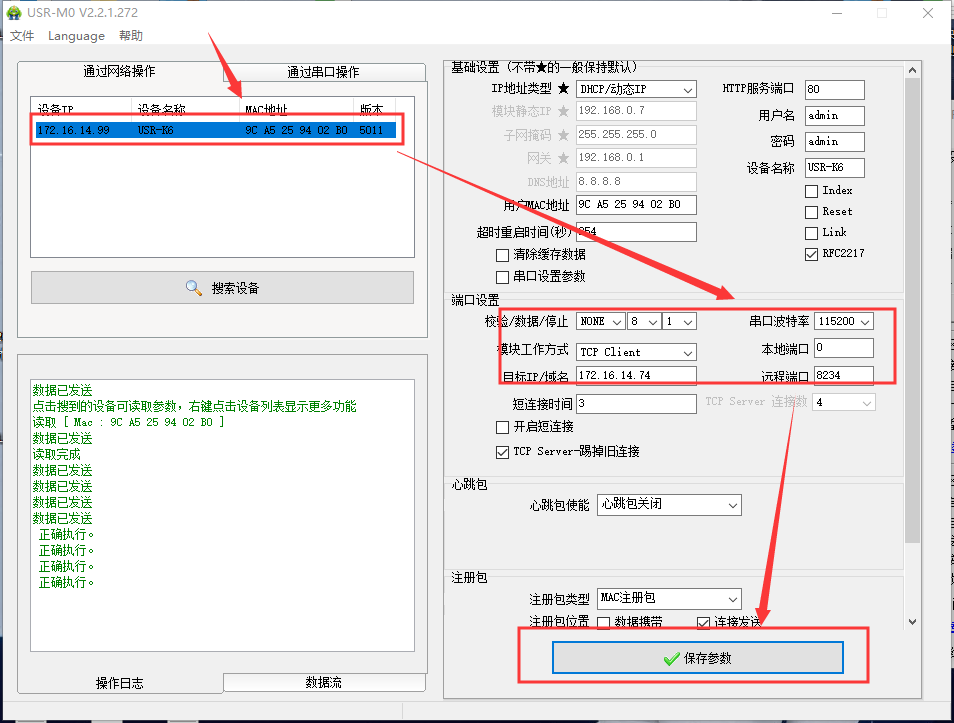 點(diǎn)擊“搜索設(shè)備”當(dāng)搜索列表中出現(xiàn)K6的設(shè)備后,單擊搜索到的設(shè)備,查看其配置信息,工作方式選擇TCP Client,目標(biāo)ip為PC的本地IP:172.16.14.74,遠(yuǎn)程端口為PC的本地端口號(hào):8234