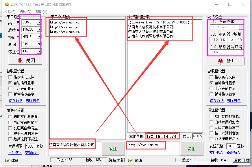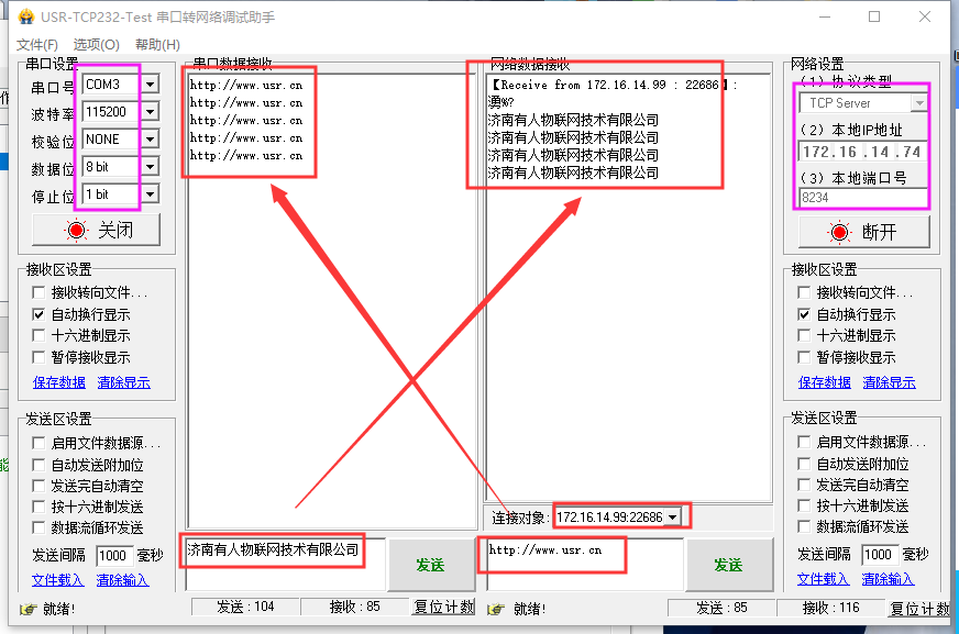 將軟件串口設(shè)置中的串口號(hào)配置為COM3。由于設(shè)備默認(rèn)協(xié)議類型為TCP Client,所以電腦端連接設(shè)備需要設(shè)置為TCP Server連接設(shè)備。