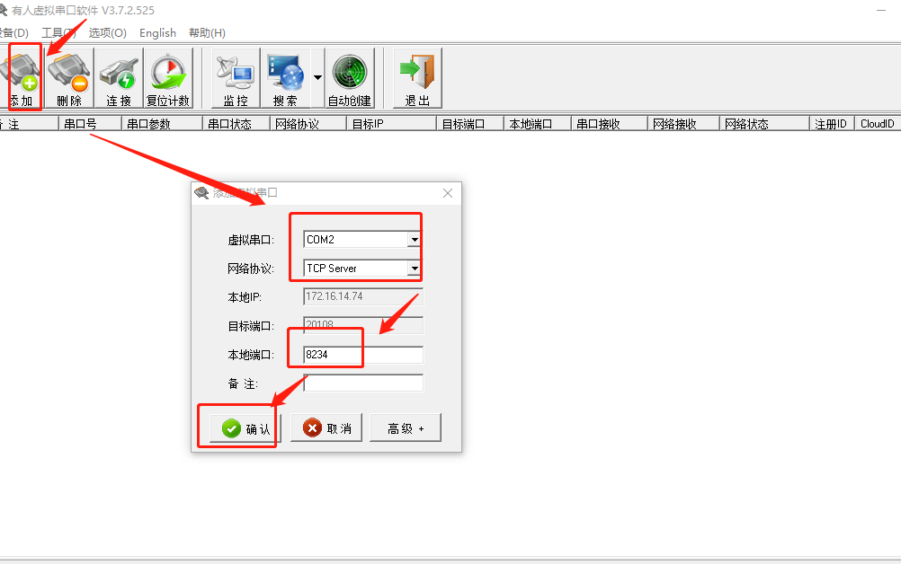 網(wǎng)絡協(xié)議選擇tcp server,本地端口設置為8234