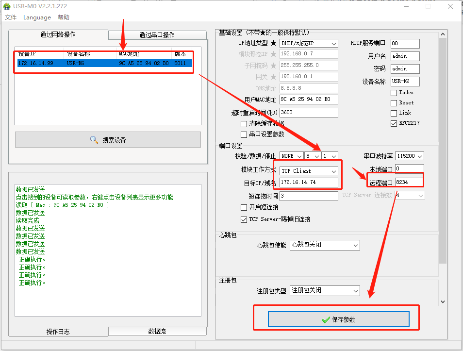 點擊“搜索設備”,當搜索列表中出現(xiàn)K6的設備后,單擊搜索到的設備,設置配置信息并保存(動態(tài)IP),工作方式選擇TCP Client,目標ip為虛擬串口IP:172.16.14.74,遠程端口為虛擬串口的本地端口號:8234