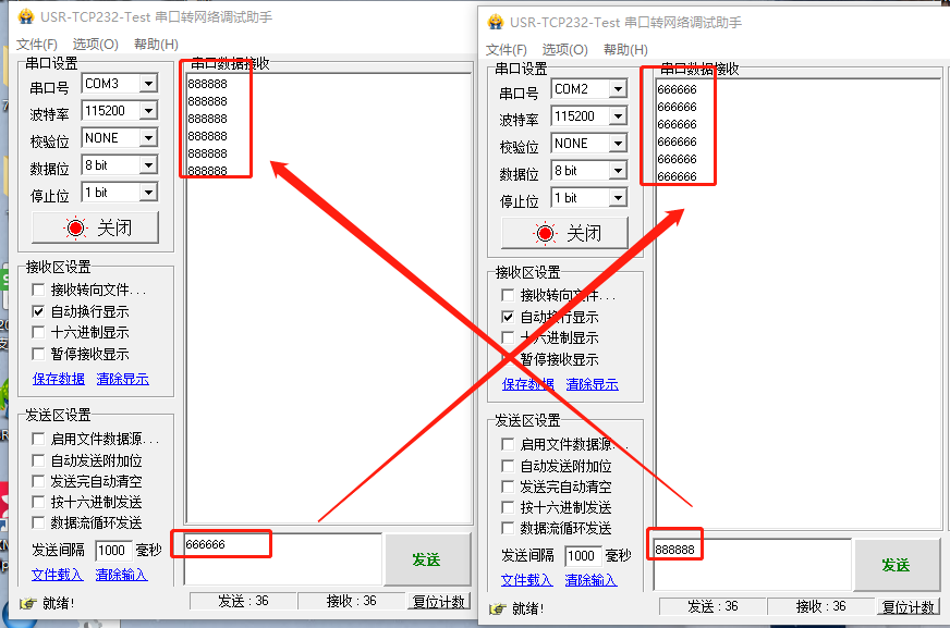同時打開兩個串口轉網(wǎng)絡助手軟件。一個選擇虛擬串口,一個選擇COM3,即可進行收發(fā)測試