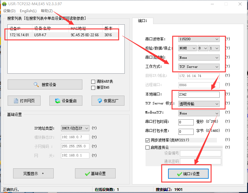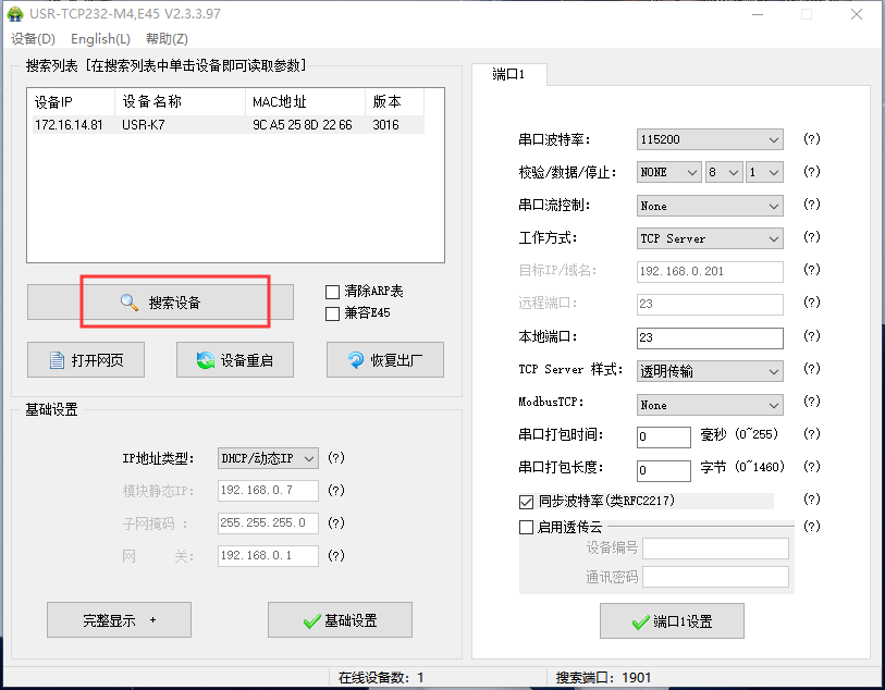 點(diǎn)擊“搜索設(shè)備”當(dāng)搜索列表中出現(xiàn)K7的設(shè)備后,單擊搜索到的設(shè)備,查看其配置信息,工作方式選擇TCP server,本地端口號(hào):2342,點(diǎn)擊端口設(shè)置保存參數(shù)。