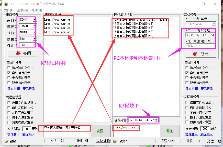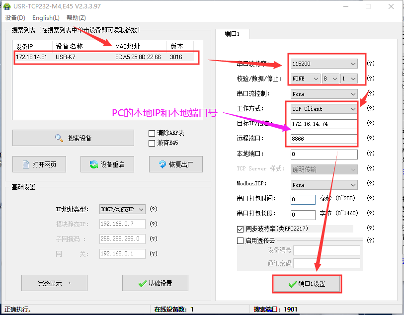 點(diǎn)擊“搜索設(shè)備”當(dāng)搜索列表中出現(xiàn)K7的設(shè)備后,單擊搜索到的設(shè)備,查看其配置信息,工作方式選擇TCP Client,目標(biāo)ip為PC的本地IP:172.16.14.74,遠(yuǎn)程端口為PC的本地端口號(hào):8866,點(diǎn)擊端口設(shè)置保存參數(shù)。