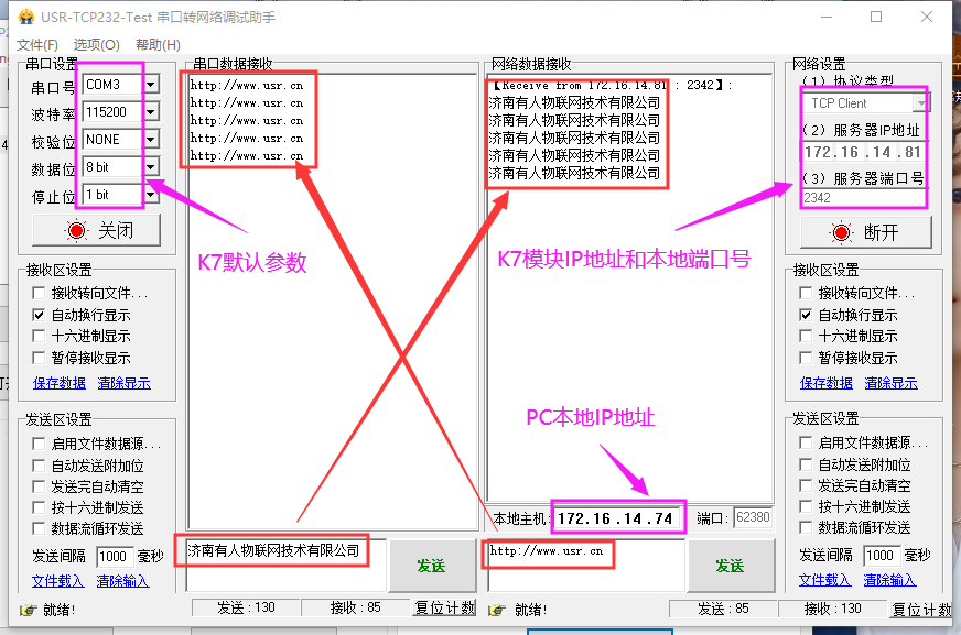 6.K7設(shè)備默認(rèn)協(xié)議類型為TCP server,所以電腦端連接設(shè)備需要設(shè)置為TCP client連接設(shè)備,服務(wù)器IP地址為K7IP地址:172.16.14.81,服務(wù)器端口為K7模塊本地端口號(hào):2342