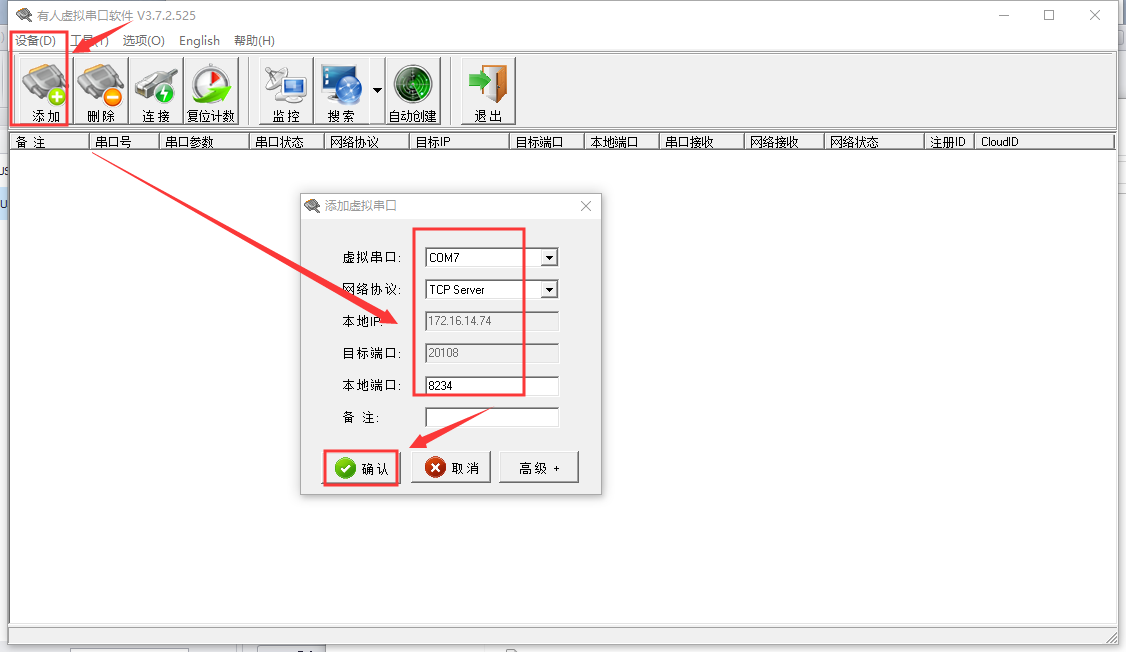 虛擬串口做tcp server,本地端口為8234