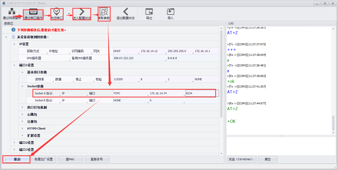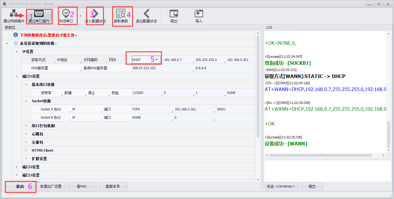 2.打開N668設(shè)置軟件,點(diǎn)擊“通過串口操作”——“打開串口”——“進(jìn)入配置狀態(tài)”——“讀取參數(shù)”,設(shè)置動(dòng)態(tài)獲取IP
