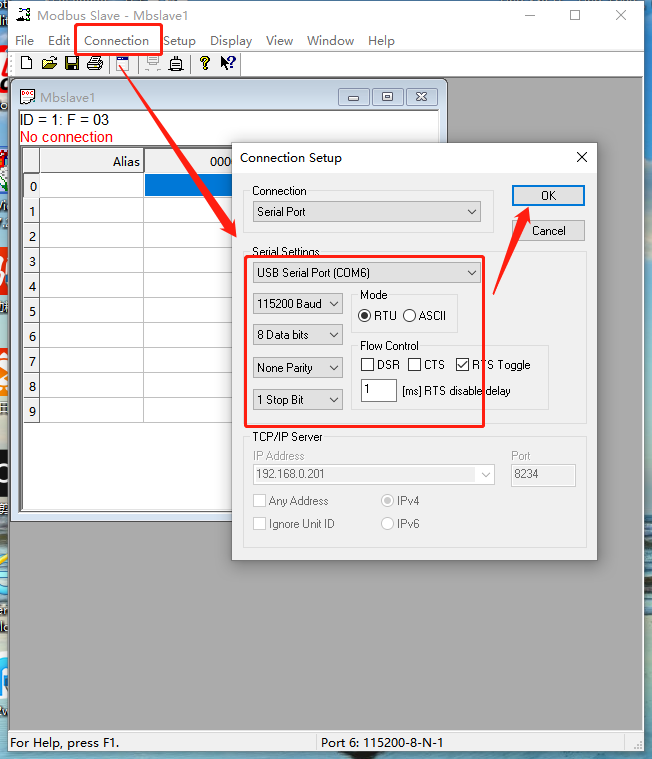 點(diǎn)擊connection--connect,選擇正確的串口以及串口參數(shù),點(diǎn)擊OK。