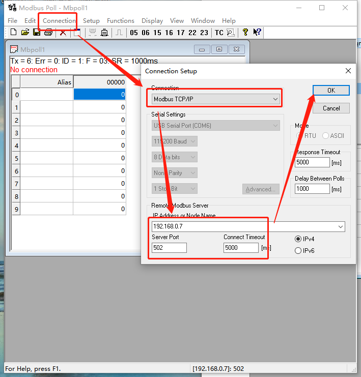 點(diǎn)擊connection--connect,connection選擇Modbus TCP/IP,IP地址填USR-M511的IP地址,Server Port填USR-M511的端口號(hào)502。注意MODBUS POLL軟件的3個(gè)時(shí)間參數(shù),依次是