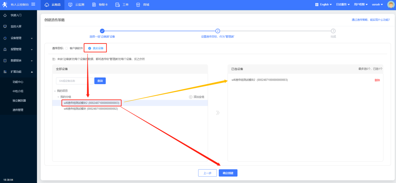 14、透傳目標選擇“真實設(shè)備”,點擊添加的第二個設(shè)備,此時已選設(shè)備中會顯示您選中的設(shè)備,點擊“確定創(chuàng)建”。