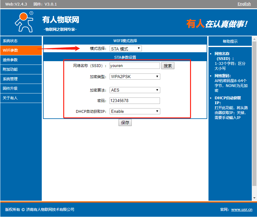 16、電腦瀏覽器地址欄輸入模塊默認ip:10.10.100.254,登入模塊的內(nèi)置網(wǎng)頁,賬號和密碼都是admin,進入以后選擇模式選擇模式選擇為sta模式,設(shè)置要連接的wifi名稱、加密類型、算法、密碼,點擊保存;color:#ff0000;font-size:10.5000pt;mso-font-kerning:1.0000pt;background:#ffff00;mso-highlight:#ffff00;">(先不要重啟,等設(shè)置完所有的參數(shù)再重啟設(shè)備)