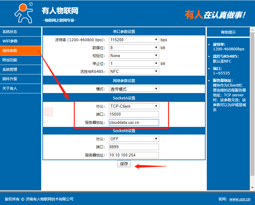 17、進入到“透傳參數(shù)”,串口參數(shù)設(shè)置為和您終端設(shè)備的串口參數(shù)一致。網(wǎng)絡(luò)設(shè)置上設(shè)置為Tcp Client,透傳云的域名為clouddata.usr.cn,透傳云的端口為15000,設(shè)置完點擊保存;