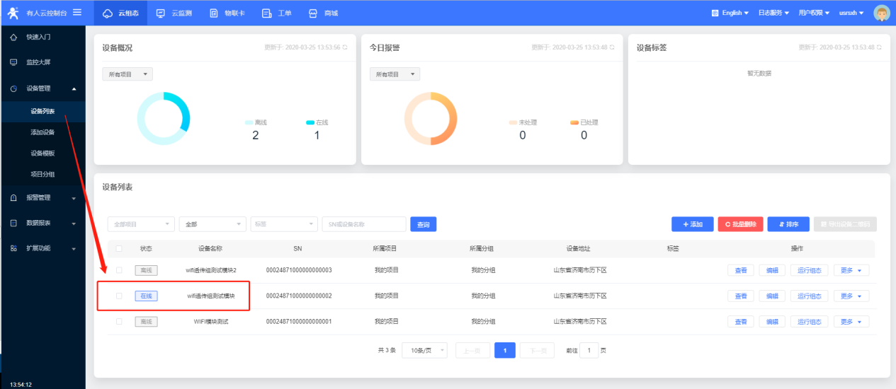 19、稍等一會,在有人云界面,您會看到該設(shè)備已經(jīng)上線。