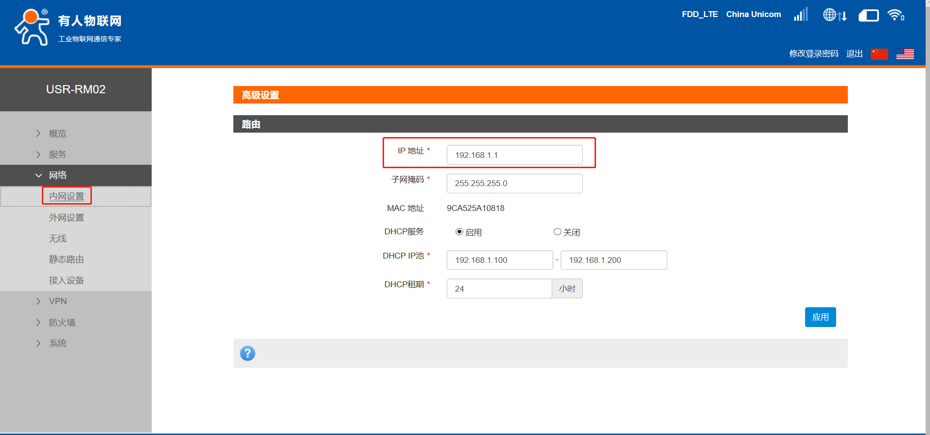 1、進(jìn)入網(wǎng)絡(luò)--內(nèi)網(wǎng)設(shè)置,進(jìn)入修改界面,出廠默認(rèn),RM02的LAN口IP為192.168.1.1
