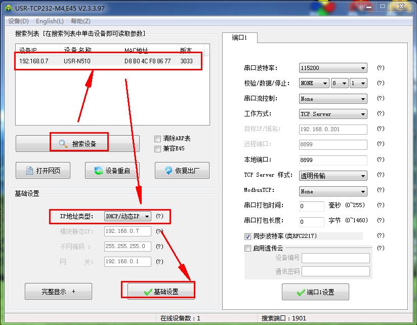 用M4設(shè)置軟件搜索USR-N510的Ip,192.168.0.7,USR-N510用串口設(shè)置軟件設(shè)置DHCp,動態(tài)獲取Ip。