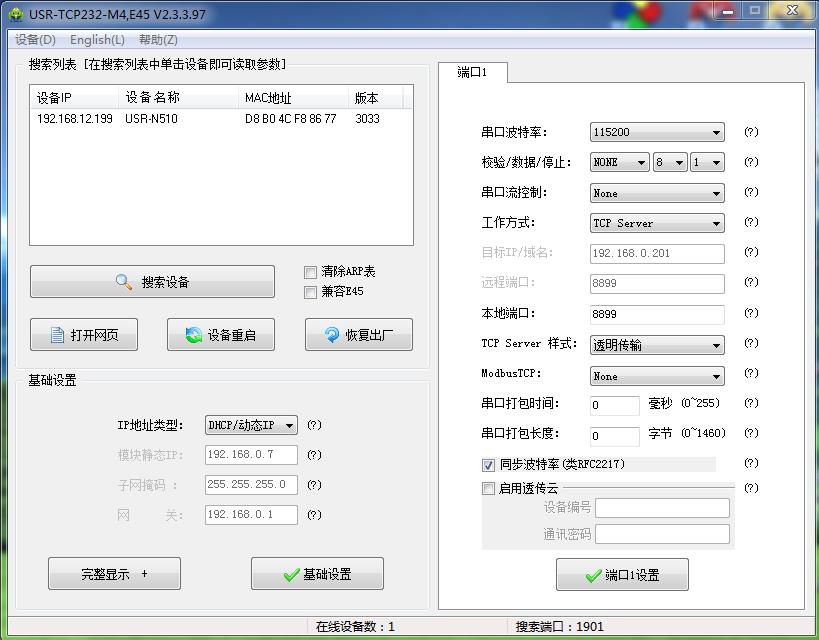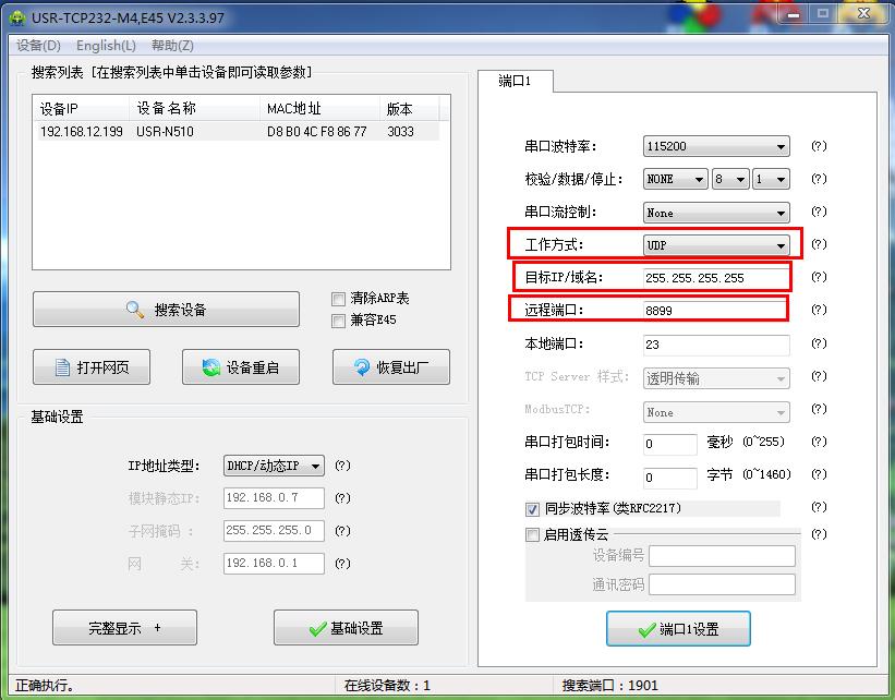 N510網(wǎng)口用網(wǎng)線接路由器,電腦也連接同一個路由器。用M4設(shè)置軟件搜索USR-N510的Ip 192.168.12.199