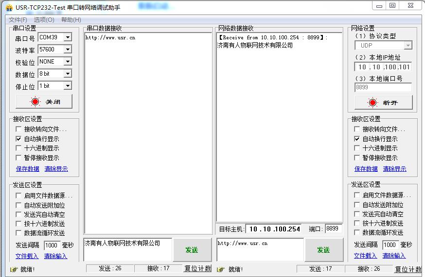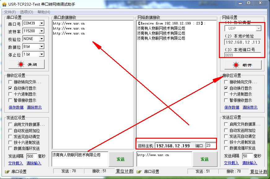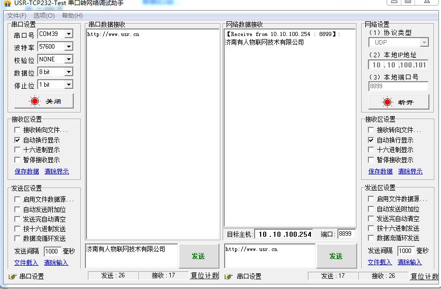 在電腦下載,并安裝打開USR-TCp232-TEST 串口網(wǎng)絡(luò)助手。建立UDp連接,就可以實現(xiàn)N510串口和網(wǎng)絡(luò)之間數(shù)據(jù)傳輸。