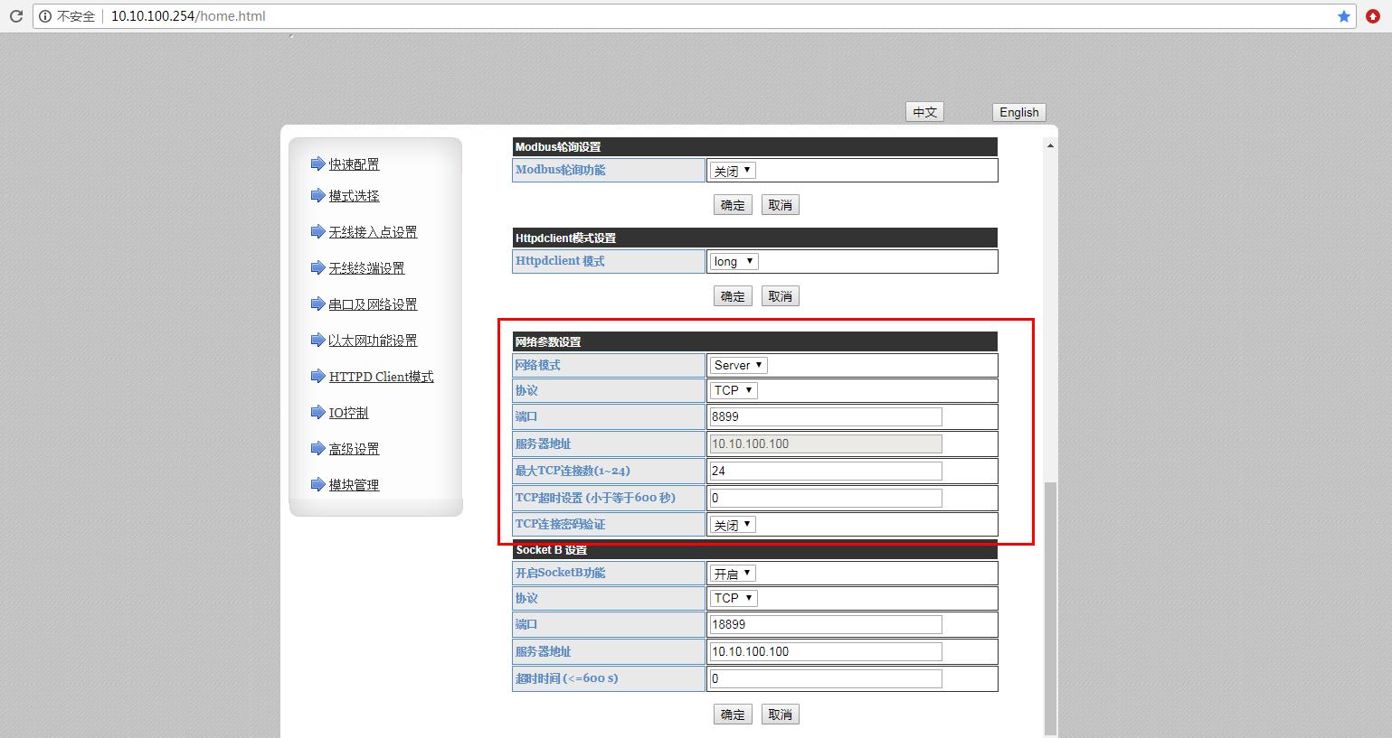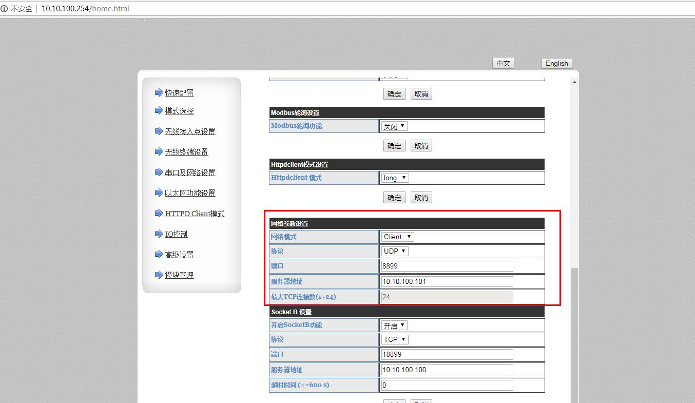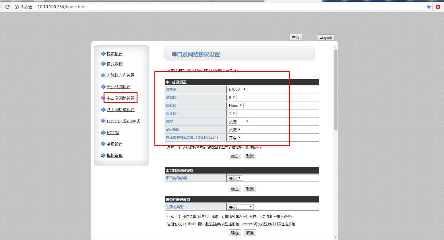用USR-WIFI232-B2的Ip 10.10.100.254 登錄USR-WIFI232-B2的網(wǎng)頁,然后修改W610的串口參數(shù)。測試4種工作模式下,串口和網(wǎng)絡(luò)的數(shù)據(jù)透傳。