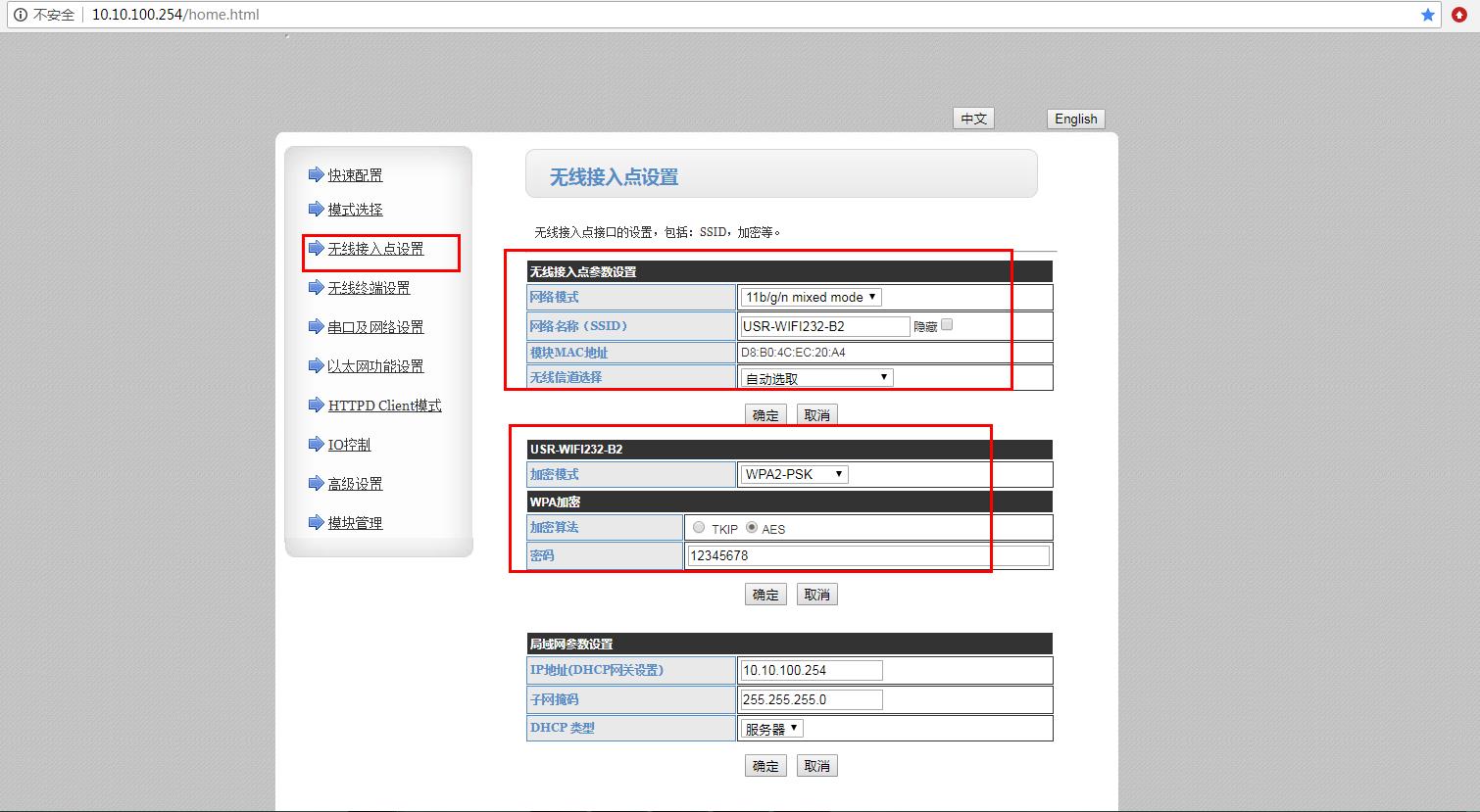 USR-WIFI232-B2設(shè)置Ap模式,電腦連接USR-WIFI232-B2的wifi。電腦瀏覽器輸入B2的Ip,登錄B2內(nèi)置網(wǎng)頁,可以配置參數(shù),修改參數(shù)之后保存重啟。