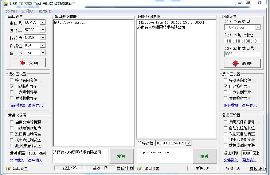 在電腦上用USR-TCp232-TEST軟件測試,打開COM口,網(wǎng)絡(luò)端設(shè)置參數(shù)。