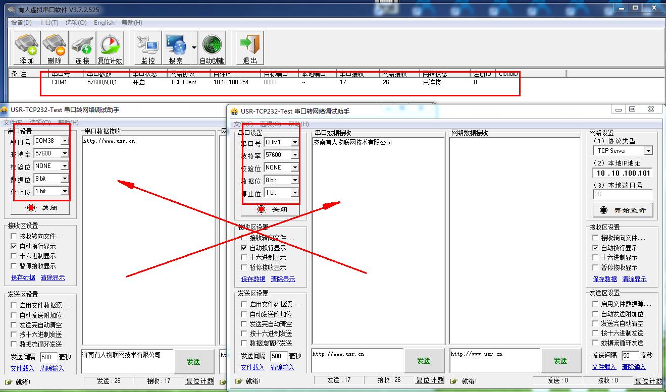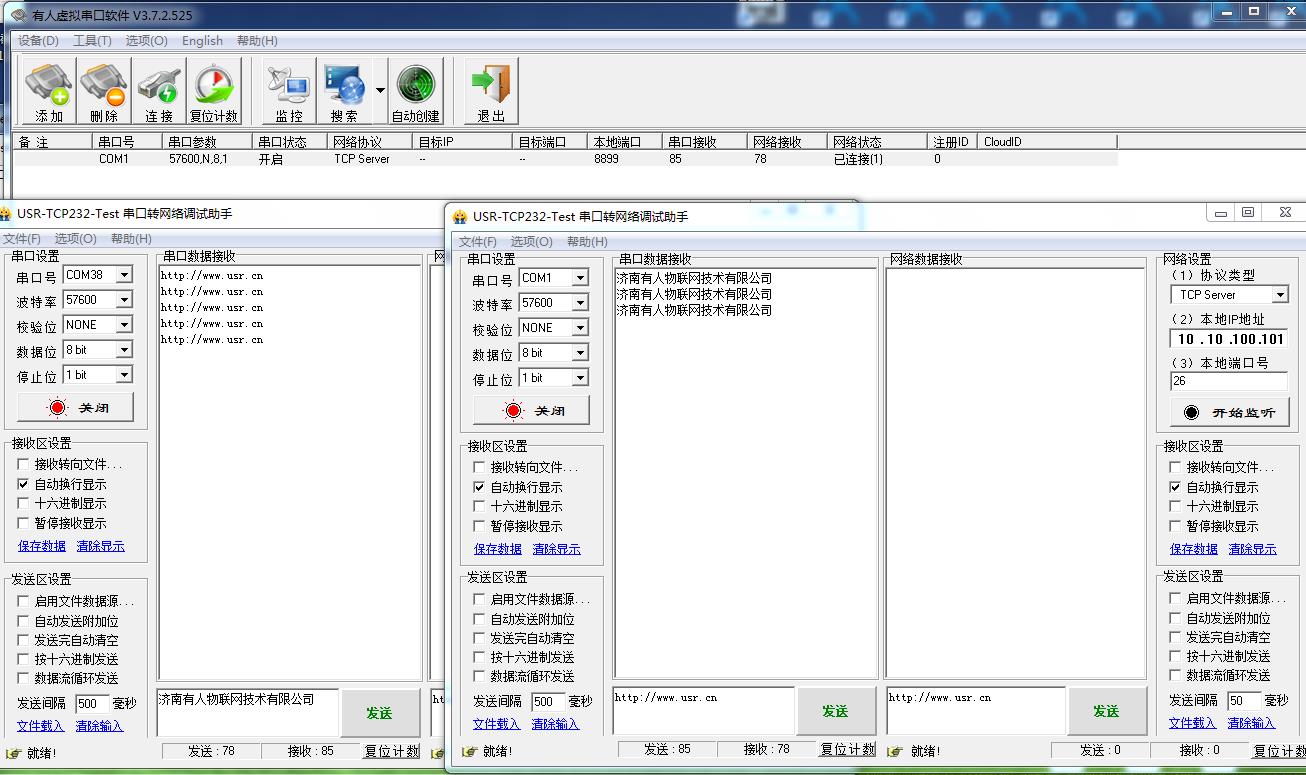 然后用兩個(gè)USR-TCp232-TEST測(cè)試串口和虛擬串口之間的數(shù)據(jù)傳輸。