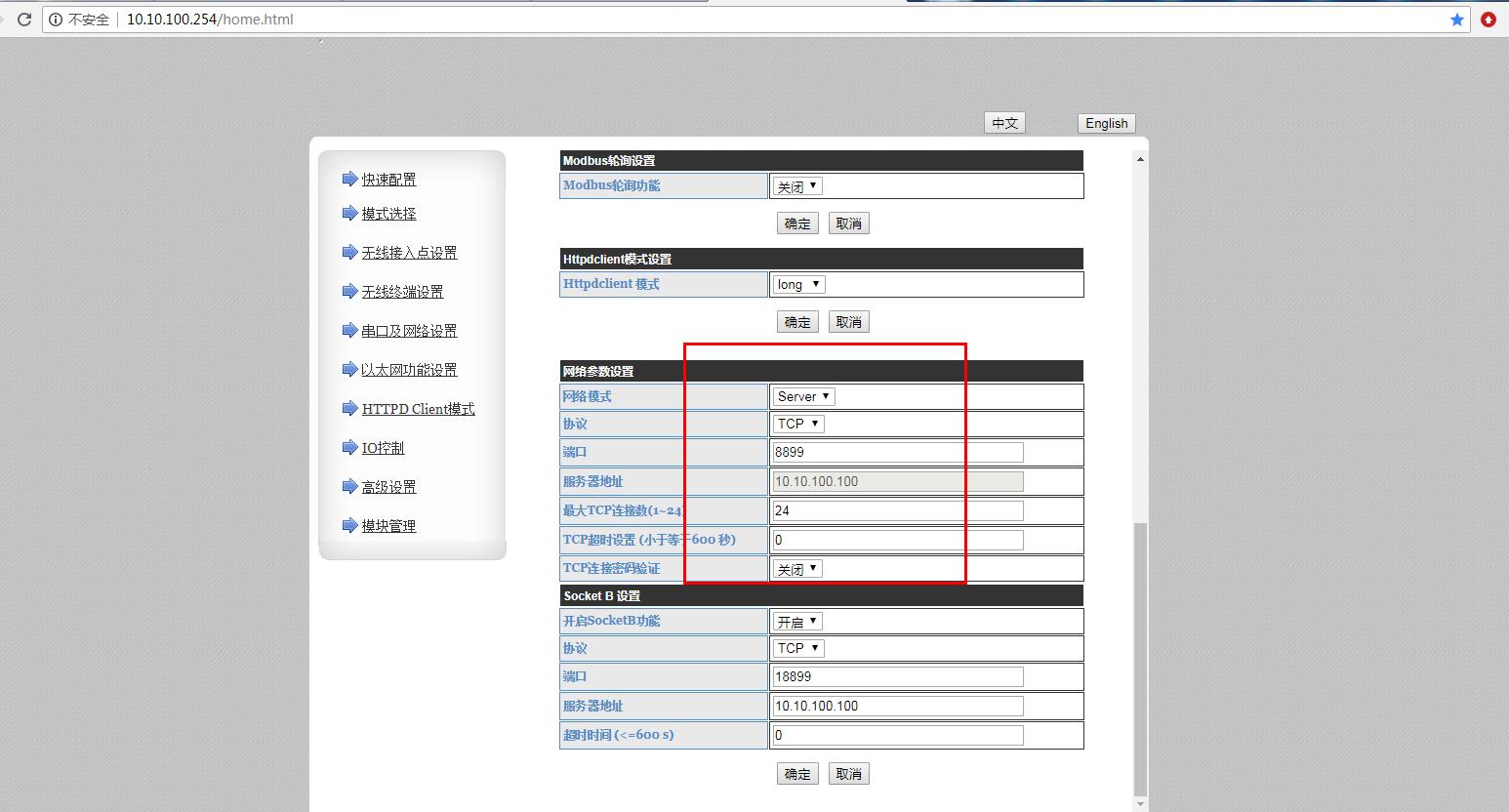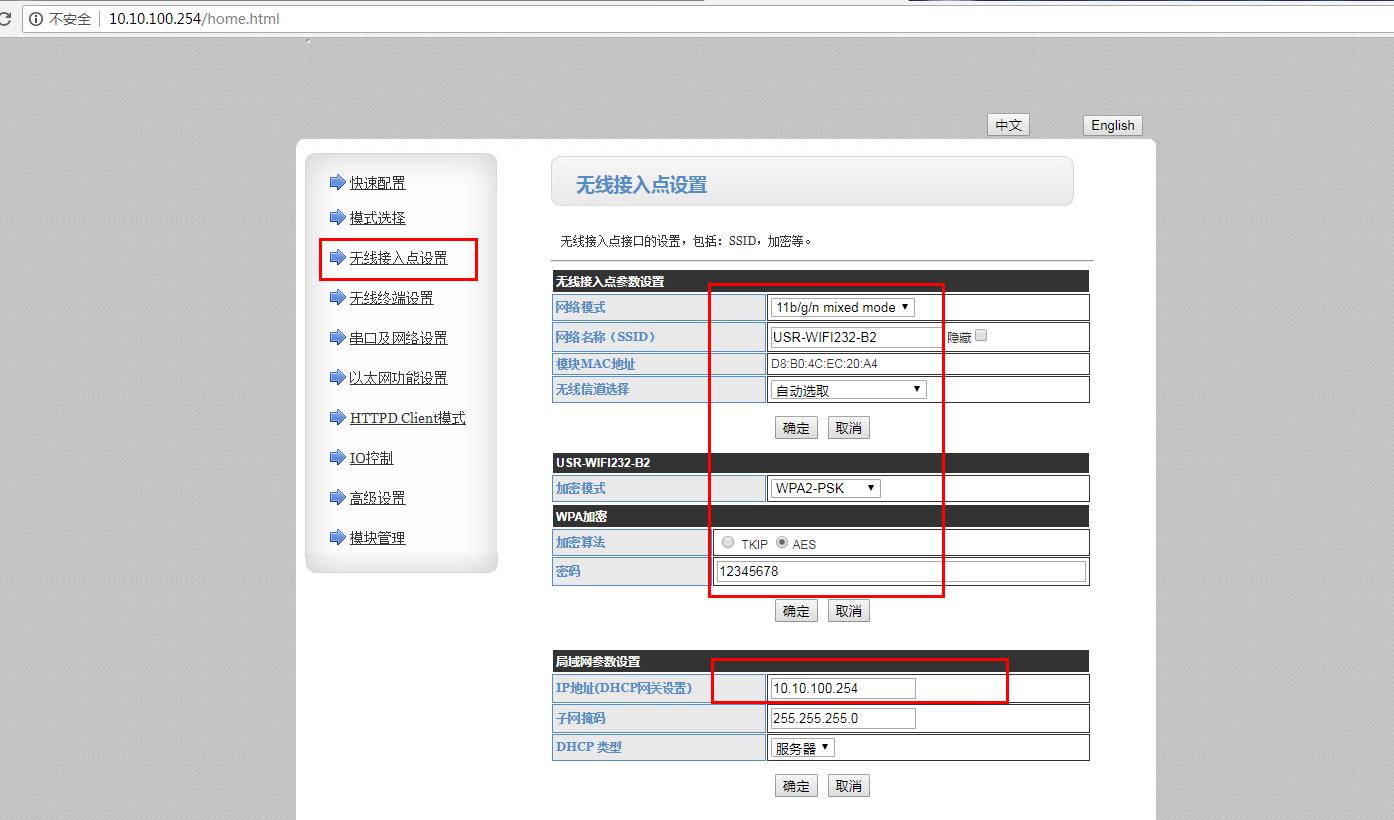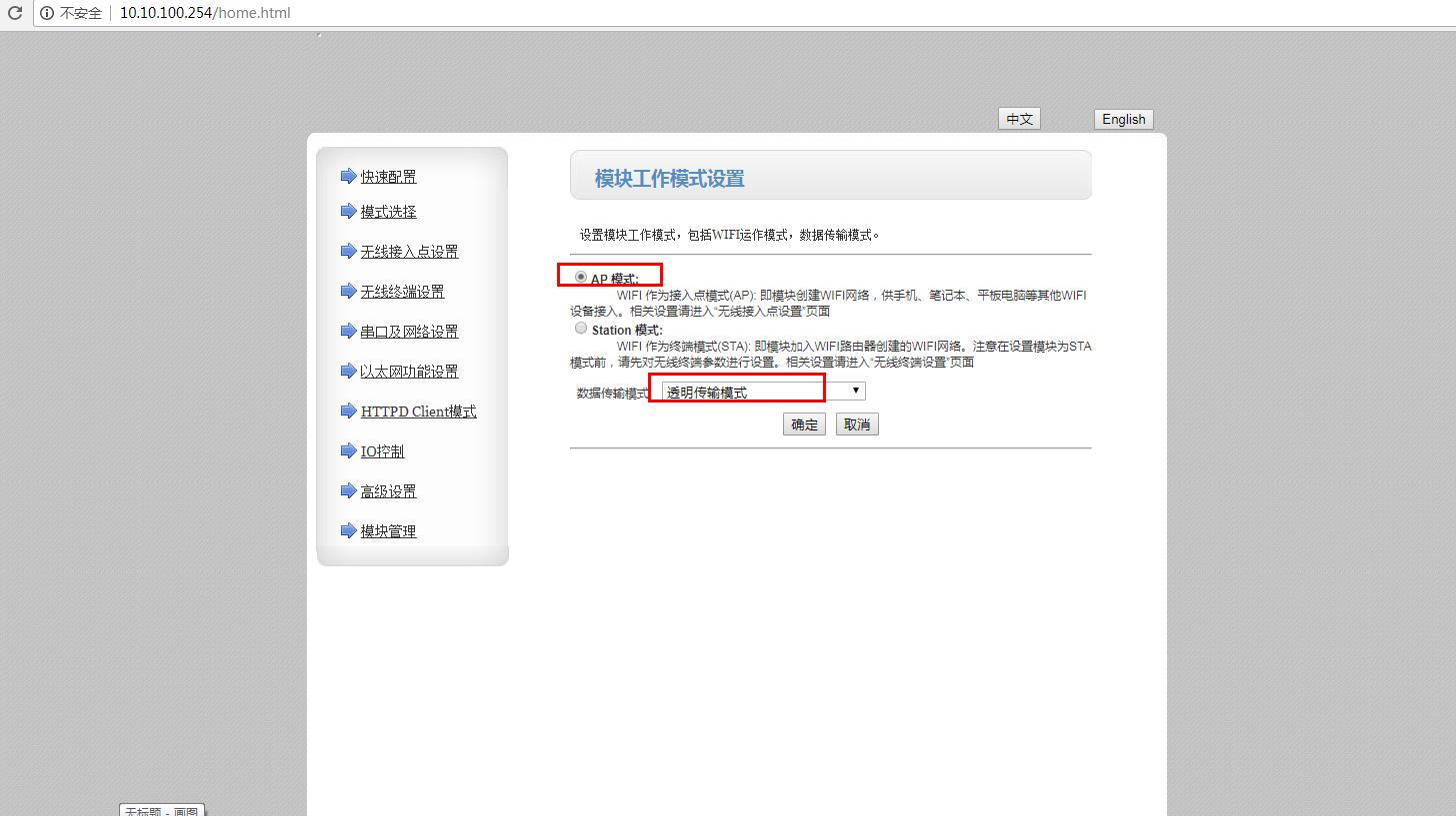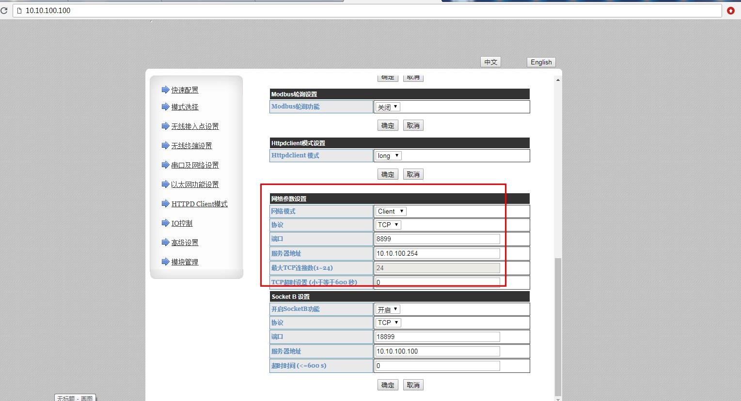 在網(wǎng)頁(yè)上將工作模式從Ap模式,保存參數(shù)。B2模塊 Ip默認(rèn)10.10.100.254。