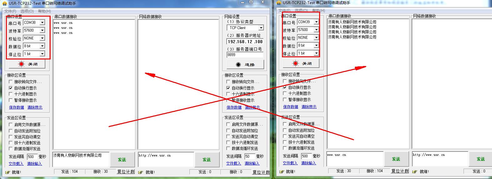 測(cè)試相互傳輸數(shù)據(jù),實(shí)現(xiàn)兩個(gè)USR-WIFI232-B2之間通過(guò)wifi連接,實(shí)現(xiàn)兩端串口232設(shè)備數(shù)據(jù)傳輸。