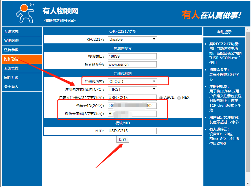 14、進(jìn)入附加功能,注冊包選擇透傳云,填上透傳云上新建立的設(shè)備id,和密碼(如下圖所示),點擊保存。