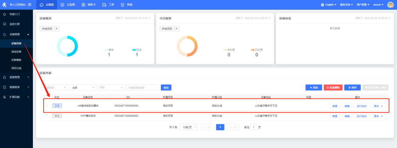 15、設(shè)置完所有的參數(shù)要重啟設(shè)備,稍等一會,在有人云界面,您會看到設(shè)備已經(jīng)上線。