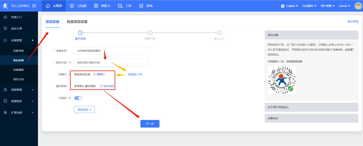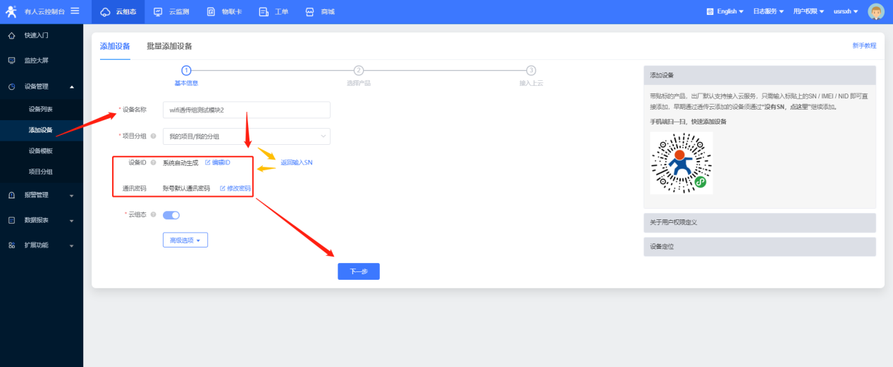 6、添加設(shè)備時,自定義設(shè)備名稱“wifi透傳組測試模塊”,wifi模塊目前只能使用ID方式添加設(shè)備id,不能直接使用SN碼添加設(shè)備, 點擊“沒有SN,點這里”,使用設(shè)備id和密碼默認(rèn)添加就可以,點擊一下步。