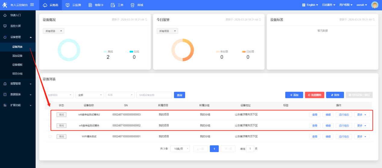 16、依據(jù)第11~15步,讓第二個wifi模塊入網(wǎng),第二個模塊的設(shè)備ID與通訊密碼填寫位透傳云模塊2的SN與密碼,配置完模塊重啟, 第二個模塊在云端顯示上線。