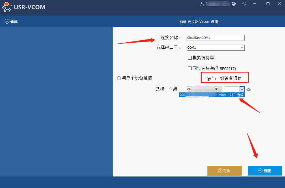 24、自定義連接名稱,選擇要虛擬的串口,點擊“與一組設(shè)備通信”,選擇在云端生成透傳組,點擊新建。