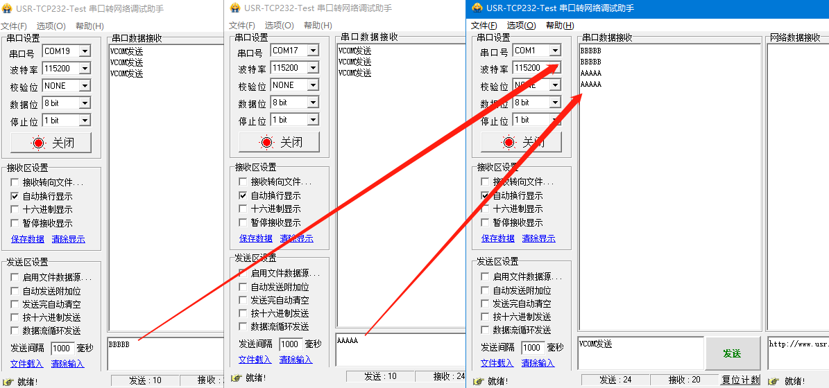 26、打開三個串口調(diào)試助手進行數(shù)據(jù)通信測試,測試結(jié)果如下。其中模塊與電腦通過串口線直連所識別出來的串口號可以在設(shè)備管理器中查看。
