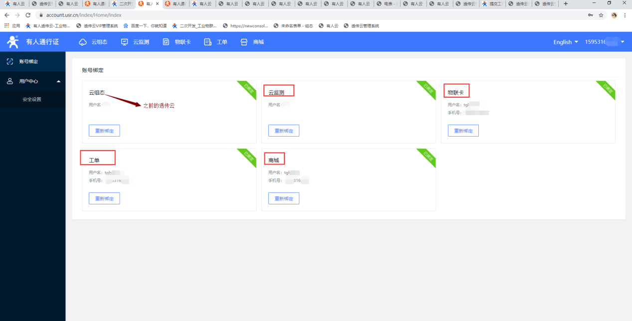 4、可以重新創(chuàng)建云組態(tài),如果以前使用過透?jìng)髟瓶梢灾苯咏壎ㄍ競(jìng)髟频馁~號(hào),由此界面綁定物聯(lián)網(wǎng)卡平臺(tái),工單系統(tǒng),云檢測(cè),和商城。