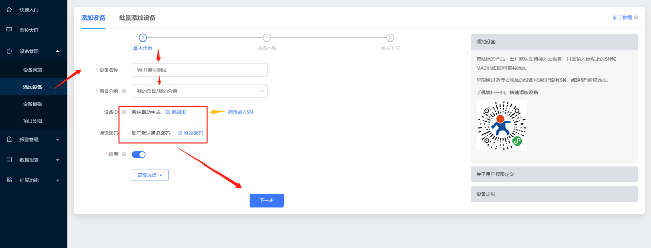 9、再次添加設(shè)備,名稱設(shè)置“wifi透?jìng)鹘M測(cè)試模塊”,設(shè)備ID與通信密碼自動(dòng)生成后點(diǎn)擊“下一步”后,選擇“數(shù)據(jù)透?jìng)鳌保_認(rèn)添加。