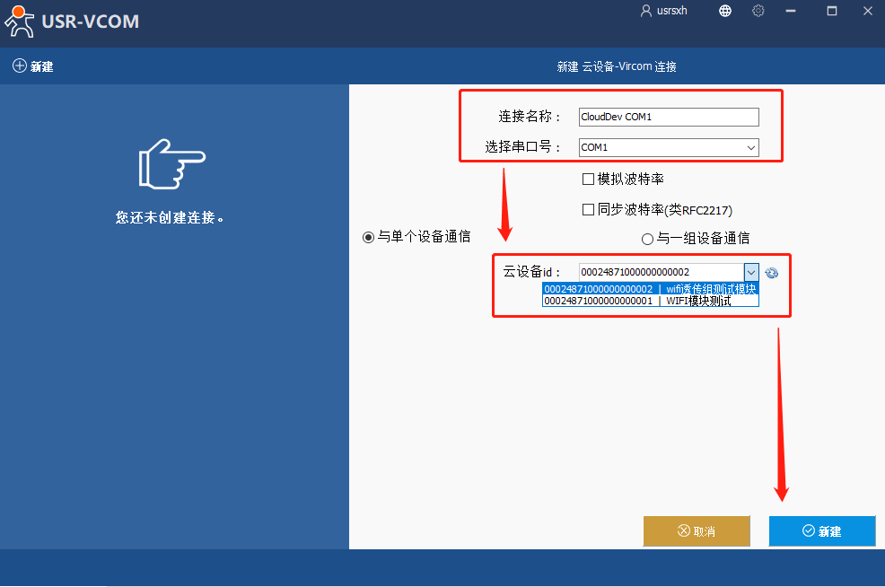 17、選擇一個(gè)沒有使用串口號(hào),選擇云端剛才添加的設(shè)備,點(diǎn)新建,生成設(shè)備對(duì)應(yīng)的虛擬串口。