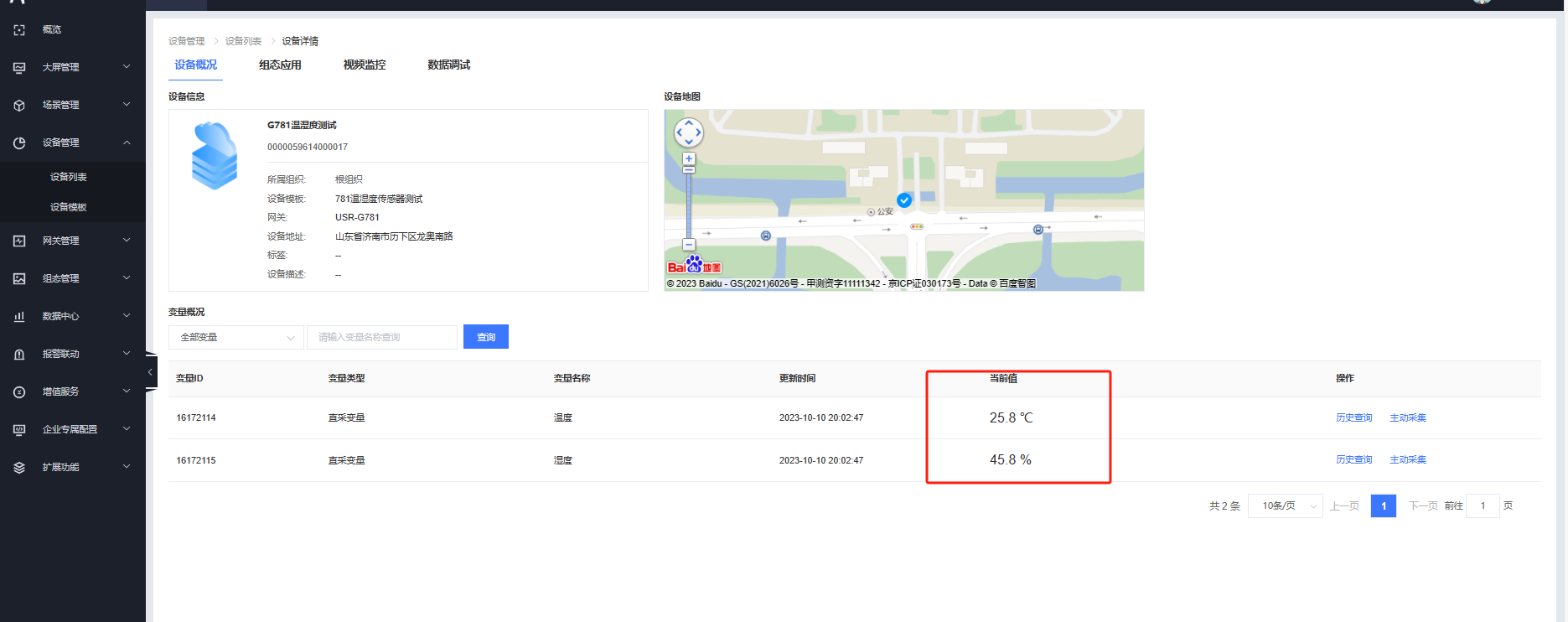 點擊設備管理--設備列表,點擊設備名稱即可看到當前變量數據。
