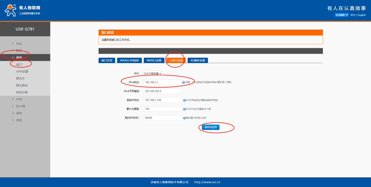 G781:網(wǎng)絡--接口--LAN口設置--IPV4地址--保存&應用
