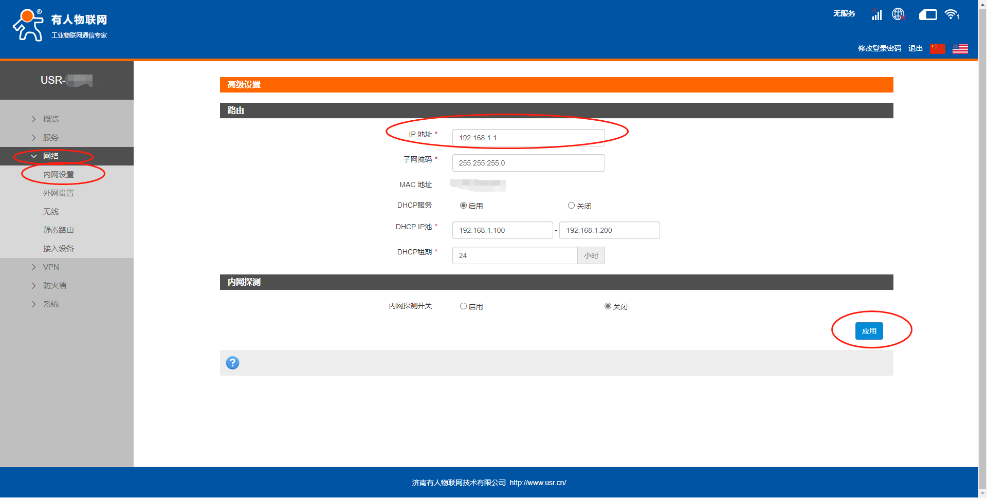 G805(包括RM02、RM03、DR801)系列:網(wǎng)絡--內(nèi)網(wǎng)設置--IP地址--應用