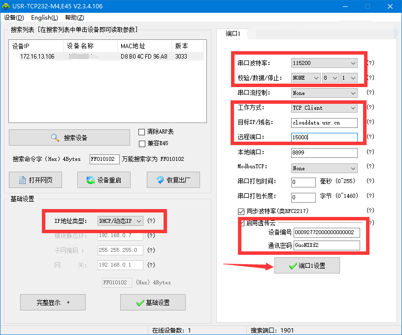 4.設(shè)置參數(shù):將工作方式 ,遠(yuǎn)程服務(wù)器地址和遠(yuǎn)程端口分別設(shè)置為:TCp client、clouddata.usr.cn、15000;