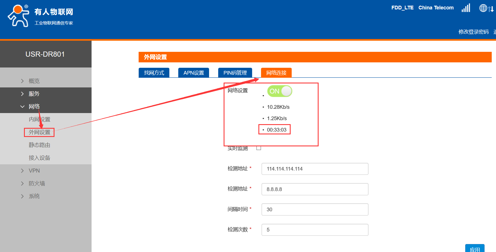 打開網(wǎng)絡(luò)--外網(wǎng)設(shè)置--網(wǎng)絡(luò)連接可以打開或關(guān)閉 4G 網(wǎng)絡(luò)連接,查看實(shí)連接時(shí)間等等