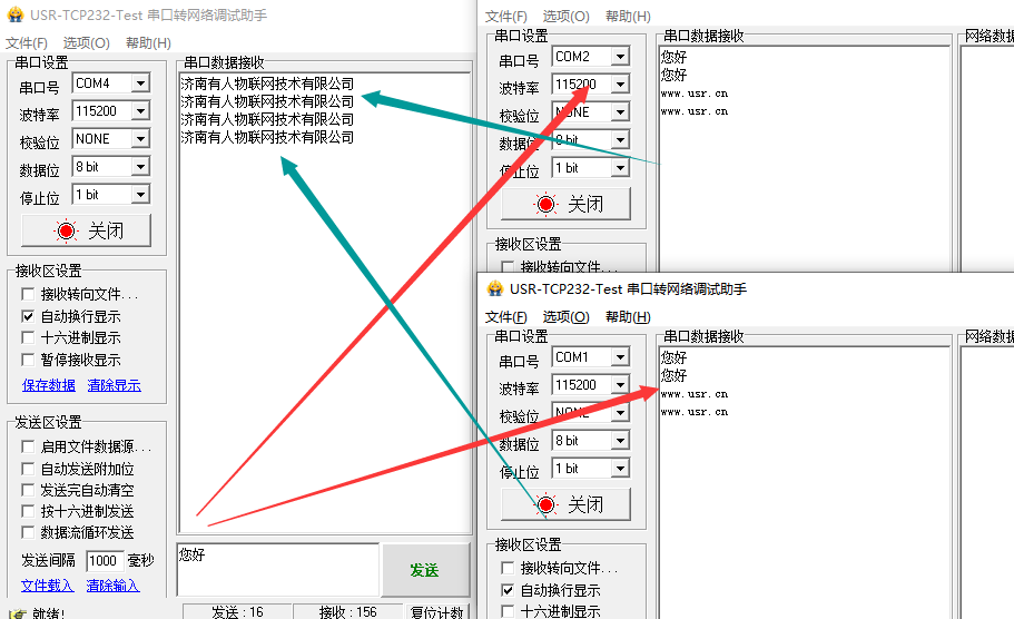 然后用兩個(gè)USR-TCp232-TEST測試串口和虛擬串口之間的數(shù)據(jù)傳輸。