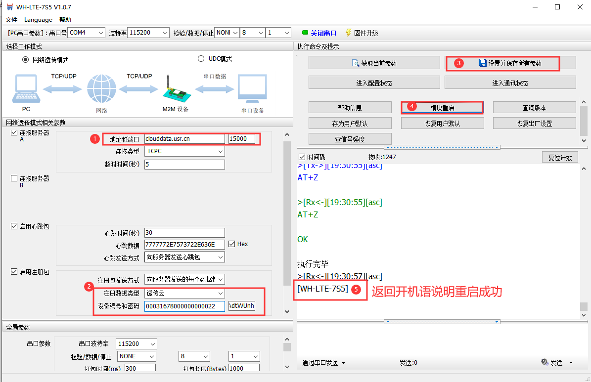 8、打開兩個(gè)USR-TCp232-TEST網(wǎng)絡(luò)助手,左側(cè)串口部分用COM4和虛擬串口COM1打開,串口參數(shù)和7S5設(shè)置一致。