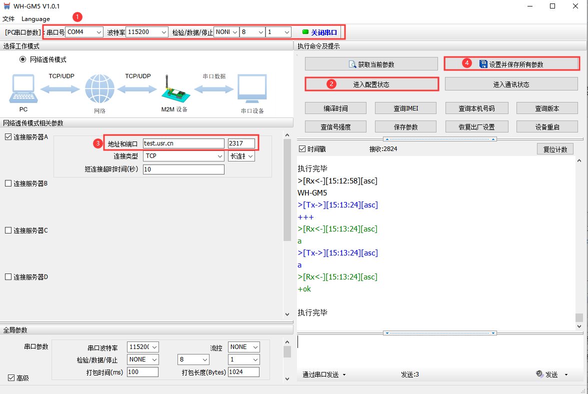 (2)打開串口——進入配置狀態(tài)——設(shè)置相關(guān)參數(shù)——設(shè)置并保存所有參數(shù)