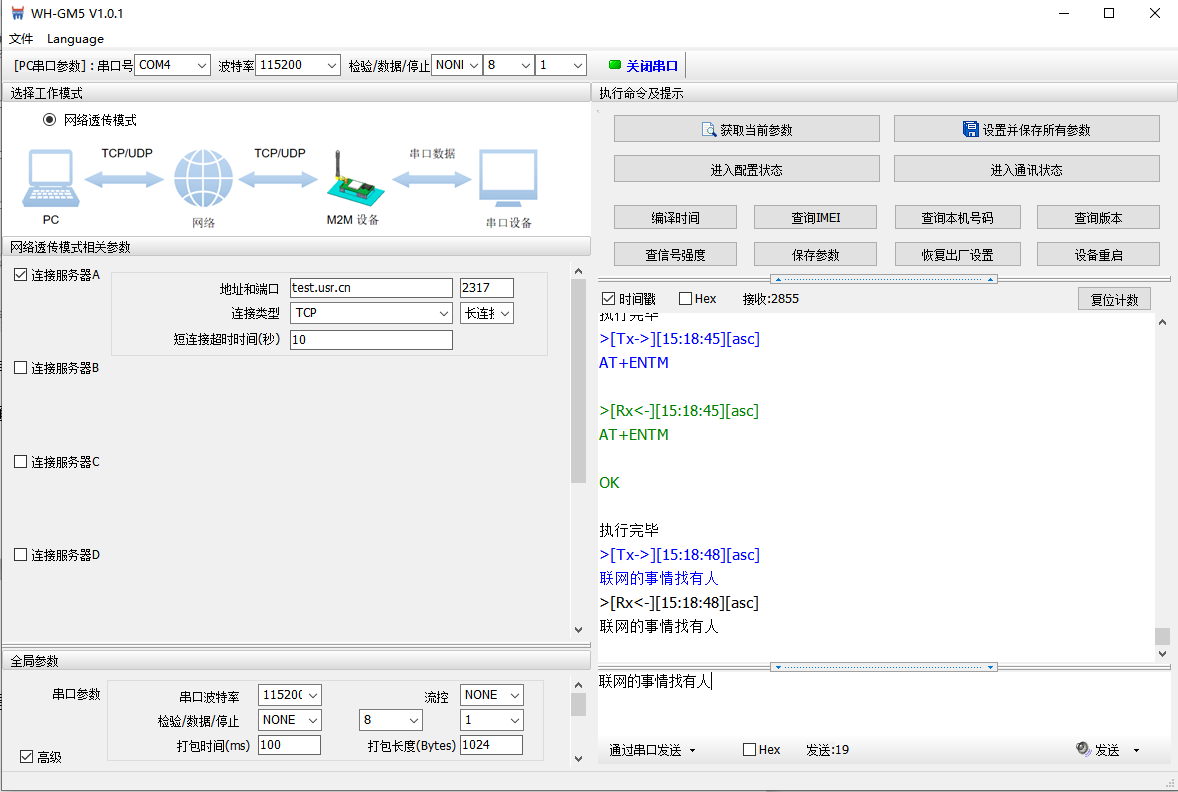 通過串口發(fā)送<聯(lián)網(wǎng)的事情找有人>,可以看到服務(wù)器返回了相同的內(nèi)容,說明模塊工作
