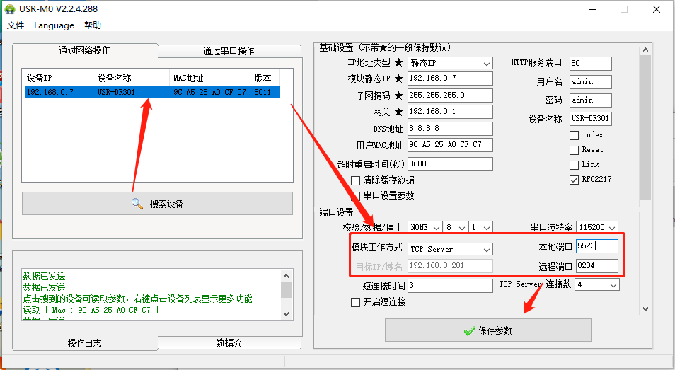 4、打開設置軟件,點擊“搜索設備”當搜索列表中出現(xiàn)301的設備后,點擊搜索到的設備,模塊工作方式設為TCP SERVER,本地端口5523,點擊保存參數(shù)。