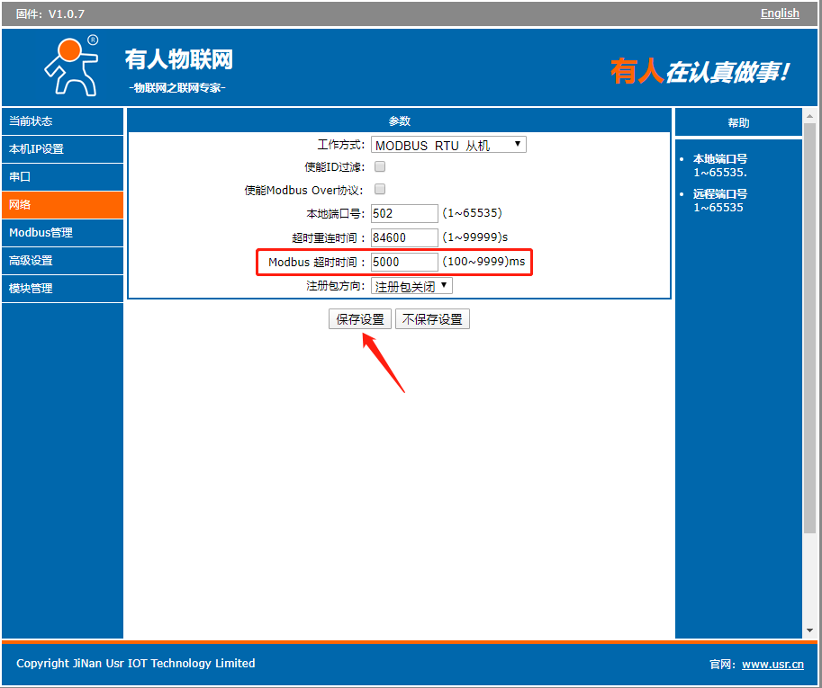 5、網(wǎng)絡(luò)里面的MODBUS 超時時間設(shè)置大一點,可以設(shè)置成5000。點擊保存設(shè)置。