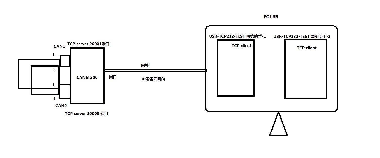 CANET200網(wǎng)口用網(wǎng)線連接電腦網(wǎng)口,電腦IP和USR-CANET200的IP設置同一網(wǎng)段。